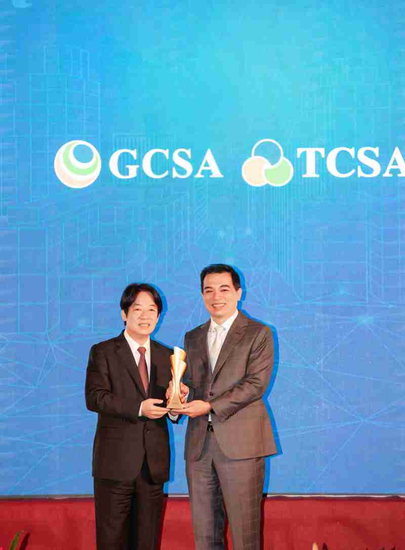 达全方位永续表现获全球永续奖及台湾永续奖肯定,,,由副总统赖清德颁奖 (左),,918.COM总经理柯富仁 (右) 代表领奖