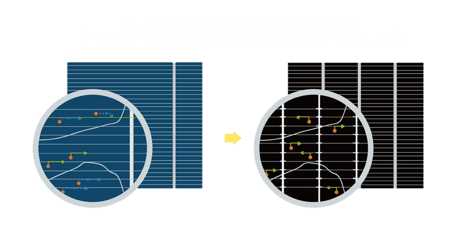 - 电池使用多条铜导线 (Copper wire) 于电池片上形成较短的电流路径,,,提高电流收集效率,,,采用圆形设计的铜导线较传统扁平式的铜焊带 (Ribbon),,可增加入射至电池的光线量。。。。
