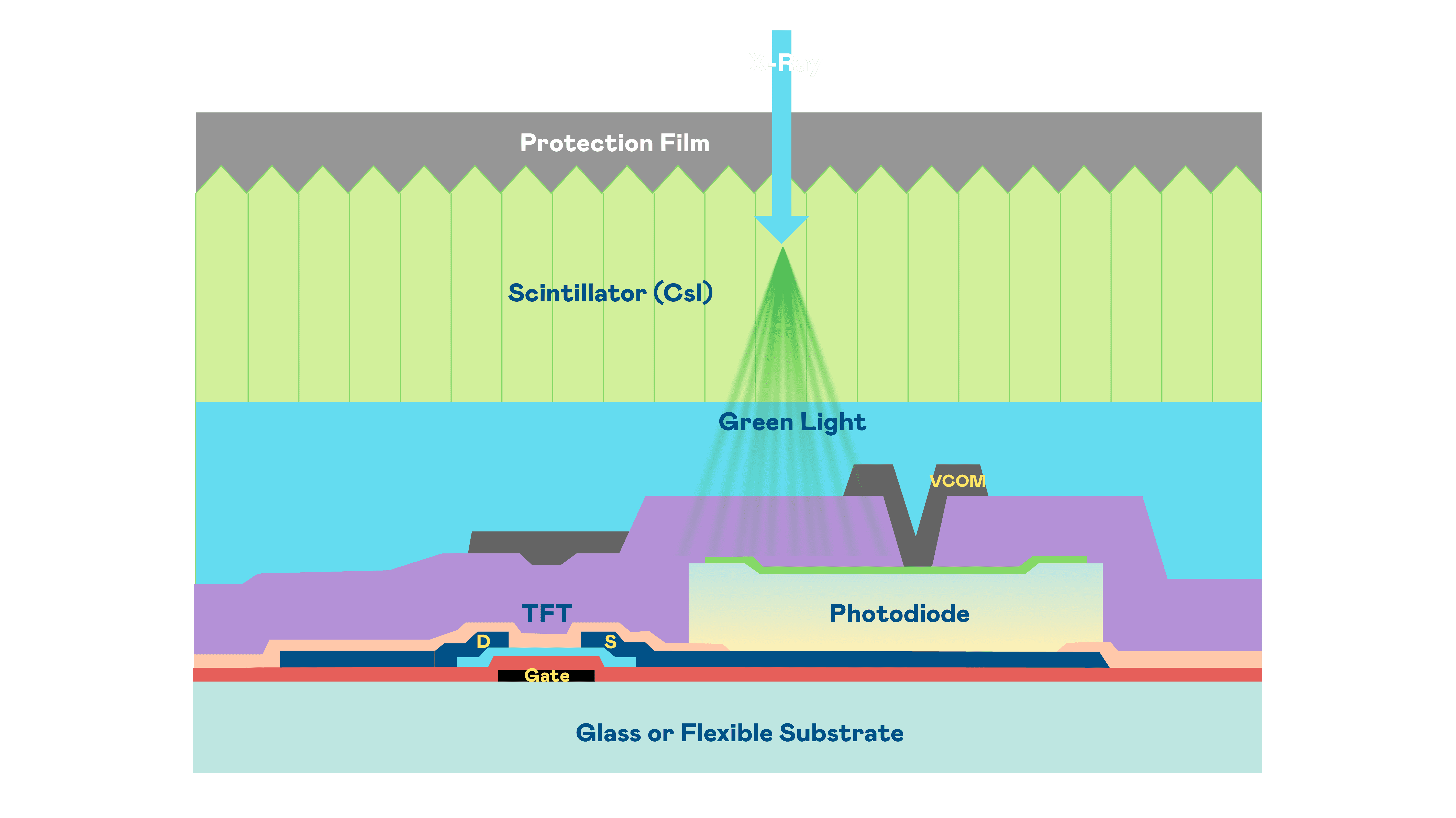 918.COM的X光影像感测阵列使用薄膜电晶体 (TFT) 作为每个像素的读取开关,,,搭配光电二极体(Photodiode)的光电转换元件,,,,用以感测X光影像讯号。。。。